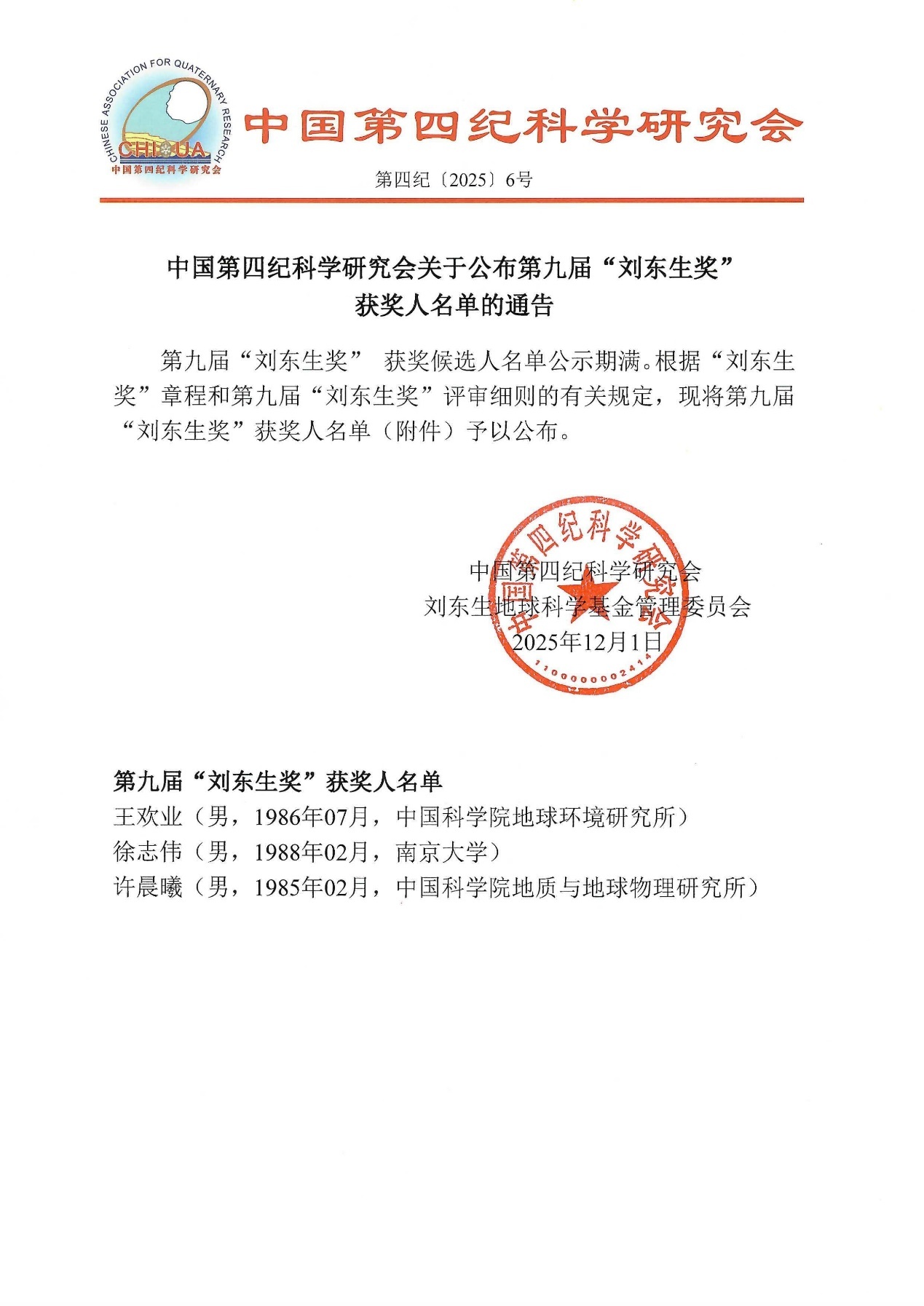 12月1日,中国第四纪科学研究会、刘东生地球科学基金管理委员会公布了“刘东生奖获奖人名单”。地球环境所王欢业研究员荣获第九届“刘东生奖”。 刘东生奖是由中国第四纪科学研究会设立的学术奖项,为弘扬刘东生院士...