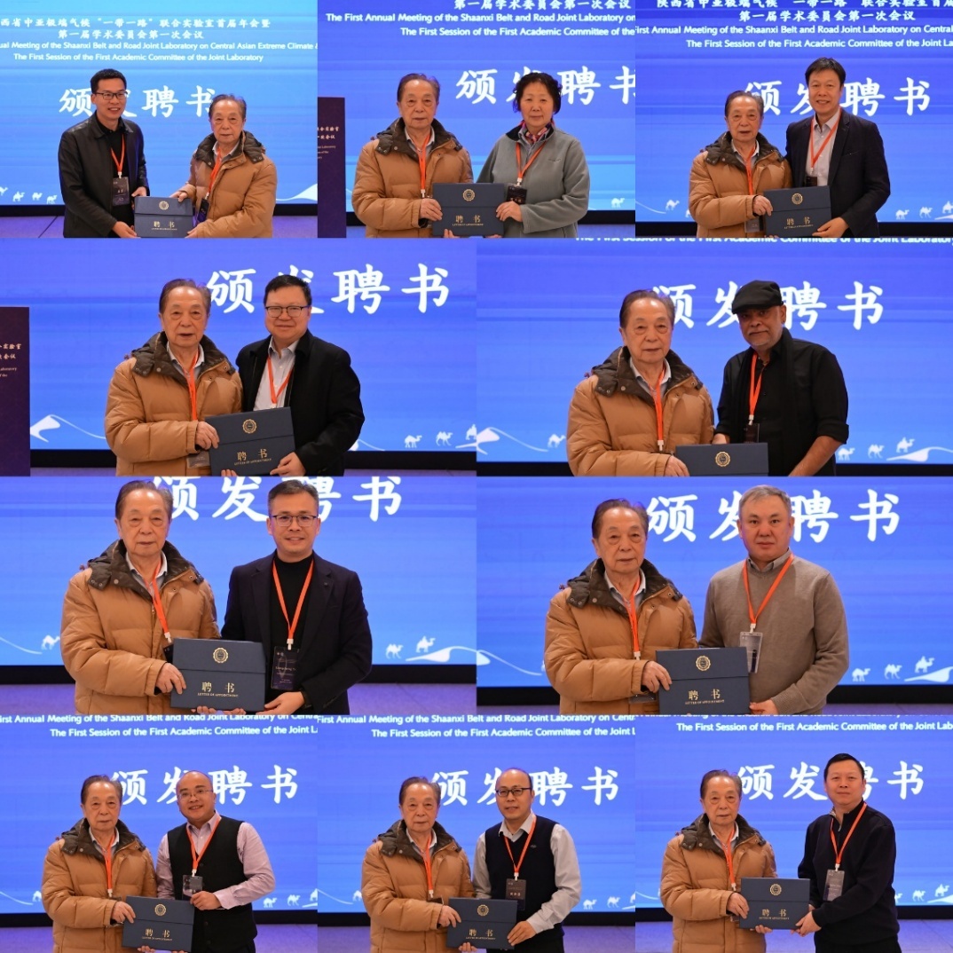 会议宣布陕西省中亚极端气候“一带一路”联合实验室第一届学术委员会委员名单,晏宏研究员代表共建单位向学术委员会主任委员安芷生院士颁发聘书,安芷生院士为到场的副主任委员及委员颁发聘书。