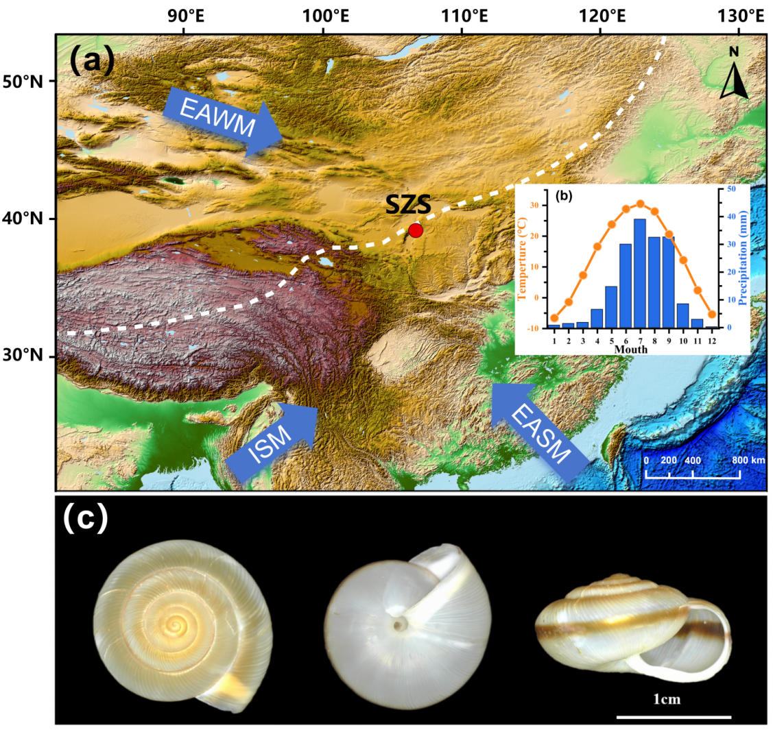 图1 (a)研究区的位置(SZS,红点)。白色虚线为现代夏季亚洲季风的大致边缘(Chen et al,2015)。EAWM、ISM和EASM分别表示东亚冬季风、印度夏季风和东亚夏季风。(b)1999~2020年研究地点的月平均温度和降水量。(c)现代条华蜗牛(Cathaica fasciola)。