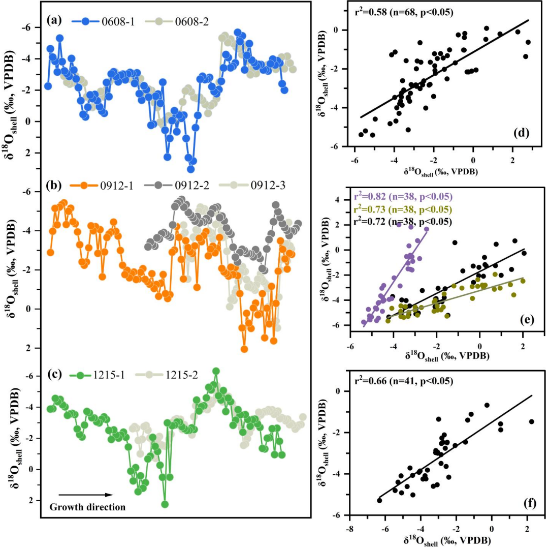 图2 2021年6月8日(a)、9月12日(b)和12月15日(c)采集的Cathaica fasciola的δ18Oshell序列,右侧对应的是相同时段蜗牛δ18Oshell的相关性分析。