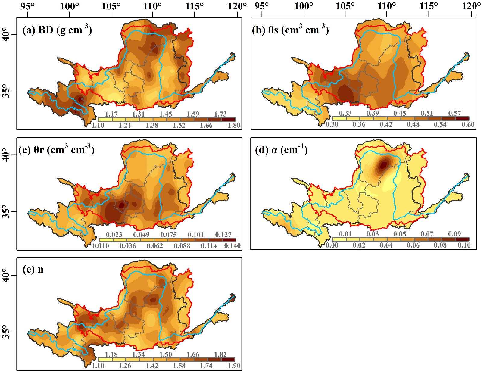 图2 黄河流域1–5 m剖面土壤水力参数空间分布