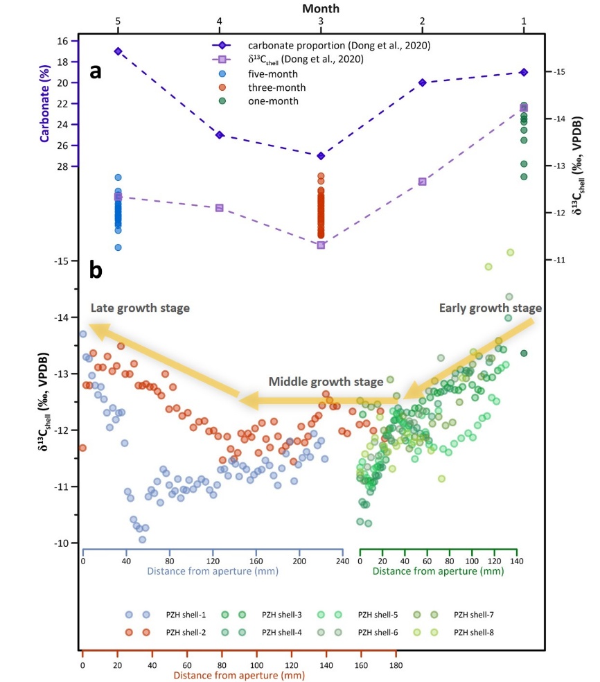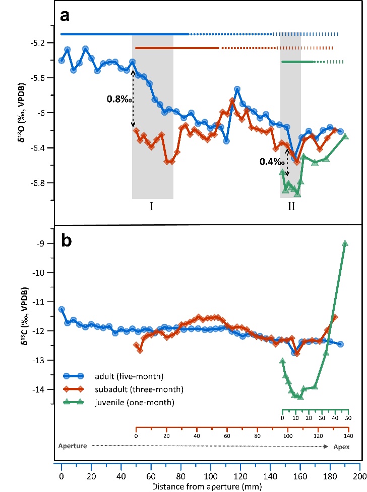 针对这一科学问题,我室“气候变化集成-模拟-同化-预测(CLIMAP)”团队,基于实验室培养的非洲大蜗牛(Achatina fulica)与四川攀枝花地区的野生蜗牛样品(Lissachatina fulica),开展了壳内高分辨率稳定同位素(δ18O和δ13C)分析,系统探讨了壳体氧、碳同位素在蜗牛个体发育过程中的主要控制因素。