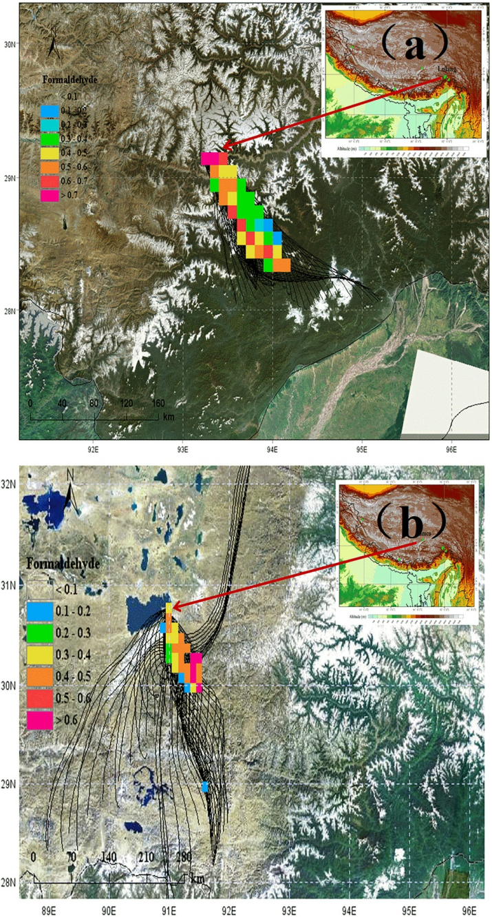 图3. 青藏高原鲁朗(a),纳木错(b)采样点大气中甲醛潜在源分布特征。