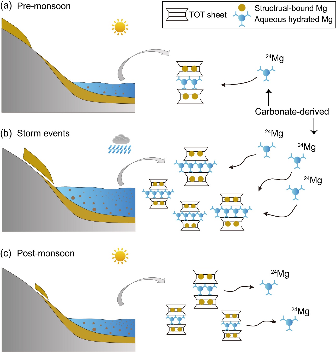 图2 季风前期、暴雨期间和季风后期岷江上游季风性水文驱动的河流Mg同位素变化示意图,显示了碳酸盐岩风化来源的24Mg的粘土吸附和解吸过程。