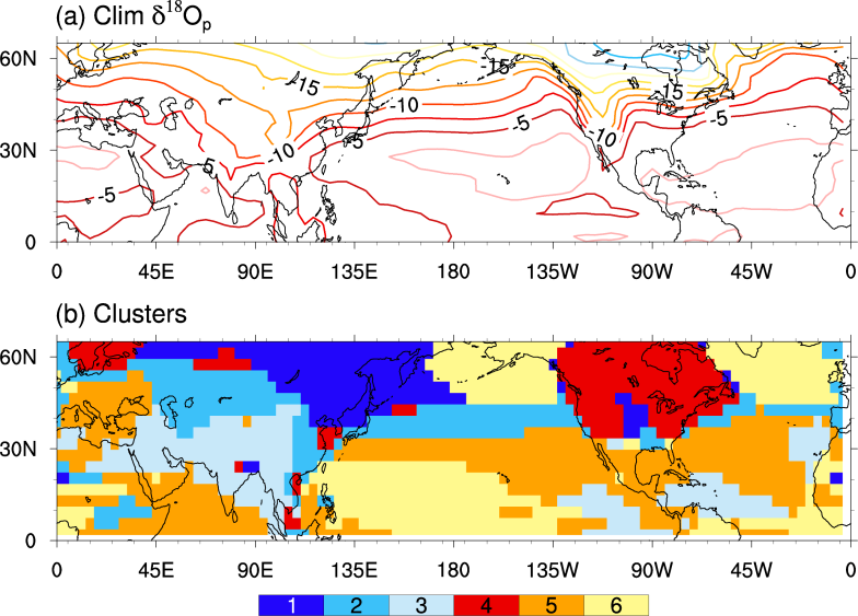 图1(a)北半球中-低纬度地区过去30万年平均δ18Op的空间分布;(b)基于过去30万年δ18Op变化序列K-means聚类分析确定的6类δ18Op时间变化型的空间分布
