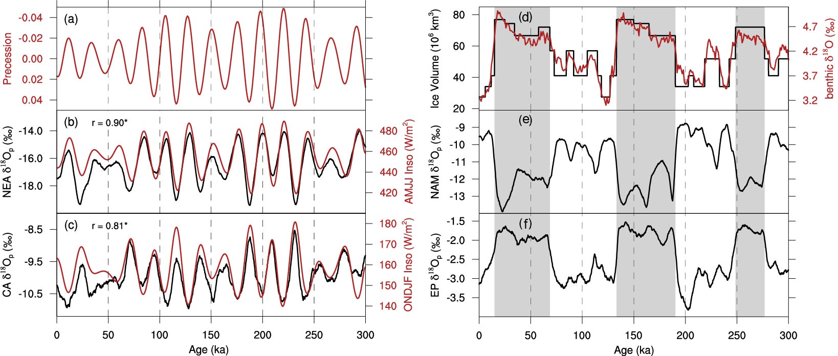 图2 (a)过去30万年岁差参数的时间序列;(b)NEA年δ18Op序列与45°N4-7月日射序列;(c)CA 年δ18Op序列与45°N10-2月日射序列。(d)瞬变模拟试验中使用的全球冰量序列和指示冰量变化的海洋底栖有孔虫δ18O序列;(e)NAM年δ18Op时间序列;(f)EP年δ18Op时间序列