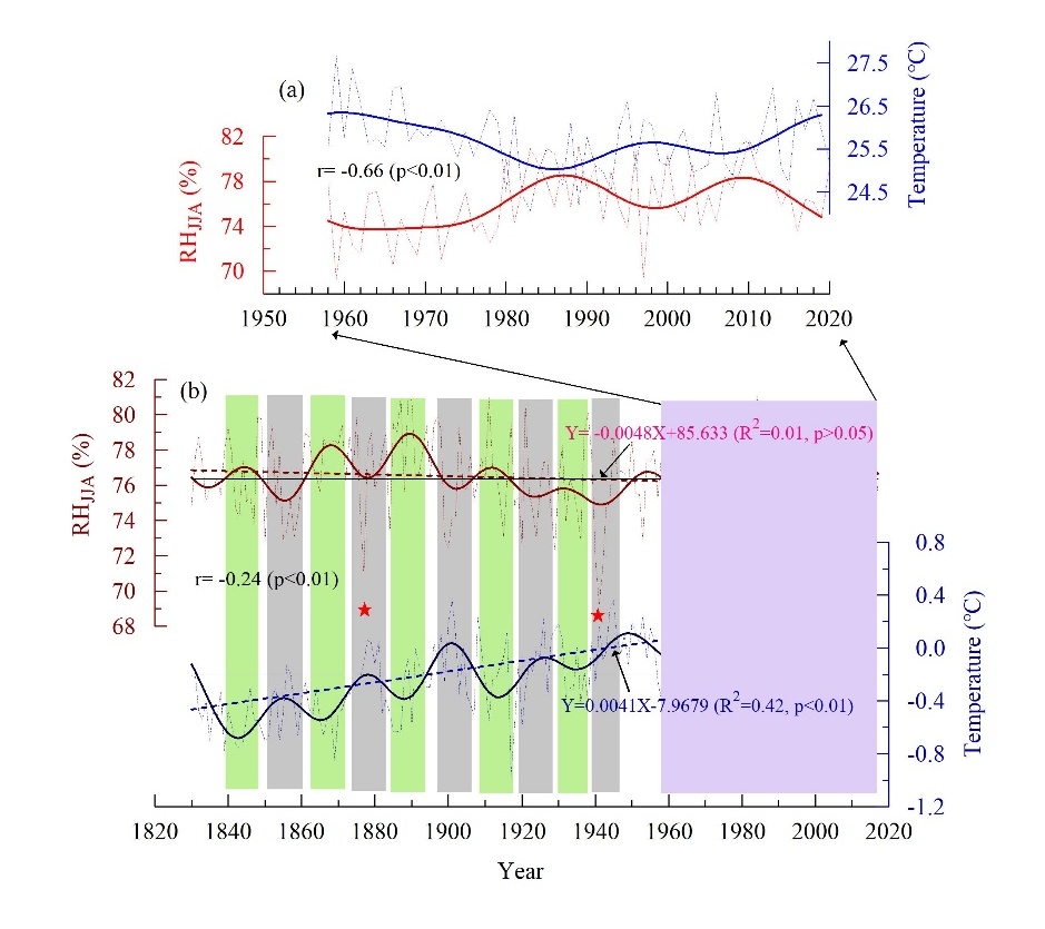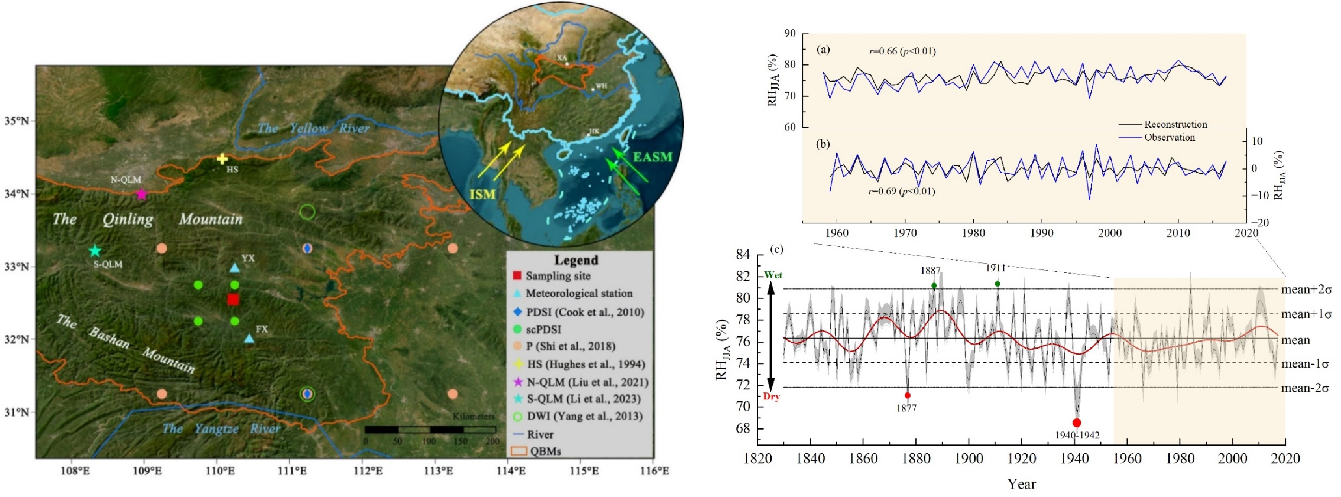 近日,我室极端气候事件及影响团队(EXCEIS)的树轮课题组研究人员,利用高分辨率树轮 δ18O 记录,定量重建了秦巴地区南部1830-2017年间的夏季相对湿度(RHJJA)变化历史(图1)。这一研究为我们打开了洞察中国“中央水塔”历史时期夏季水文气候变化的窗口。