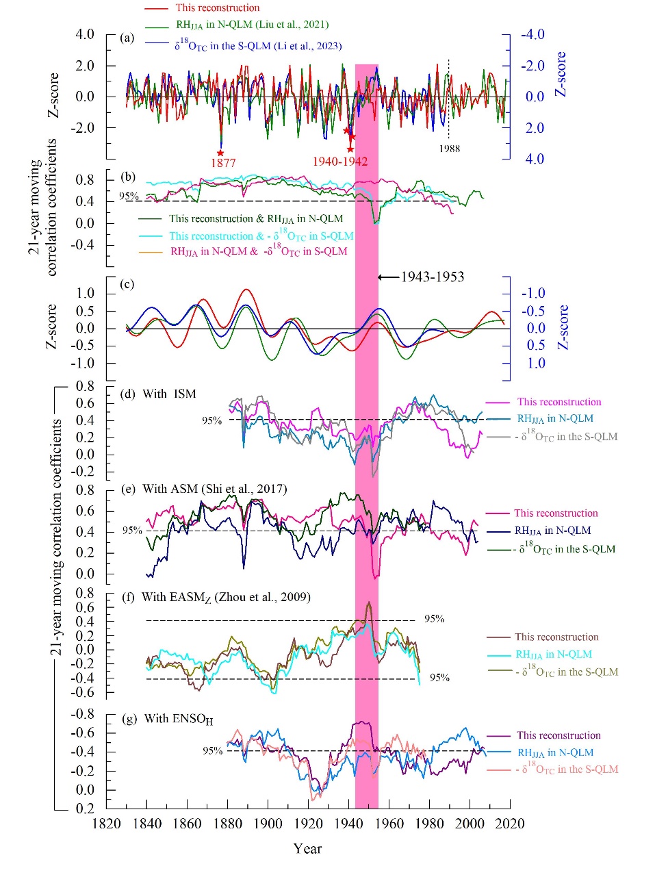 该研究揭示,中国历史时期两次特大干旱—“丁戊大旱”和“1940-1943 年大旱”,均对研究区产生重大影响,其中“1940—1943 年大旱”的影响程度更甚。重建中识别出的三个干旱期(公元 1850-1859 年、1920-1943 年、1966-1982 年)和三个湿润期(公元 1861-1875 年、1885-1898 年和 2009-2013 年)与“中央水塔”内部多地的水文气候振荡基本一致,表明秦巴地区一定时空尺度水文气候变化的同步性。然而,在1943-1953 年这连续11年期间,“中央水塔”北部和南部的年RHJJA变化存在差异,步调不一致(图2),即南部偏干旱(湿润)时北部偏湿润(干),这与亚洲夏季风内部系统的调整密切相关。此外,秦巴地区出现的干暖/湿冷的模式(图3)表明,未来气候变暖可能会加剧这一广大区域的干旱状况。