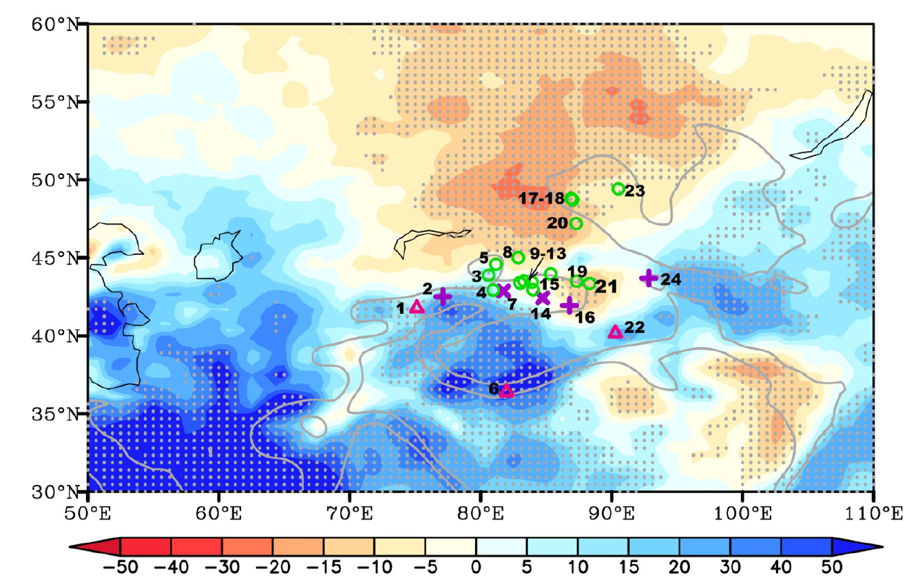 沙莹莹, 石正国, 张晓菲, 尚可, 周朋, 舒培仙, 雷婧, 李新周, 程海, 安芷生. 2025. 中全新世天山热源异常与中亚干旱区降水的偶极子响应. 中国科学: 地球科学,55(11):3793–3805,doi: 10.1360/N072025-0163