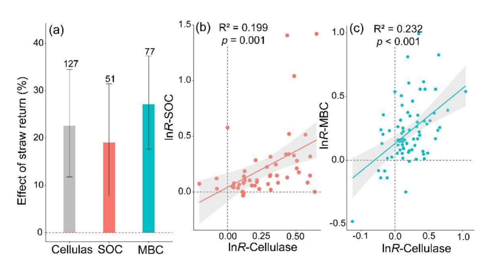 本研究进一步揭示,纤维素酶活性与土壤微生物生物量碳、土壤有机碳呈显著正相关,说明秸秆还田通过激发土壤酶活性,促进秸秆碳向土壤稳定碳库的转化。尤其是β–1,4-葡萄糖苷酶在秸秆纤维素降解中发挥关键作用,推动碳从植物残体向微生物生物量和持久性有机碳的转移。