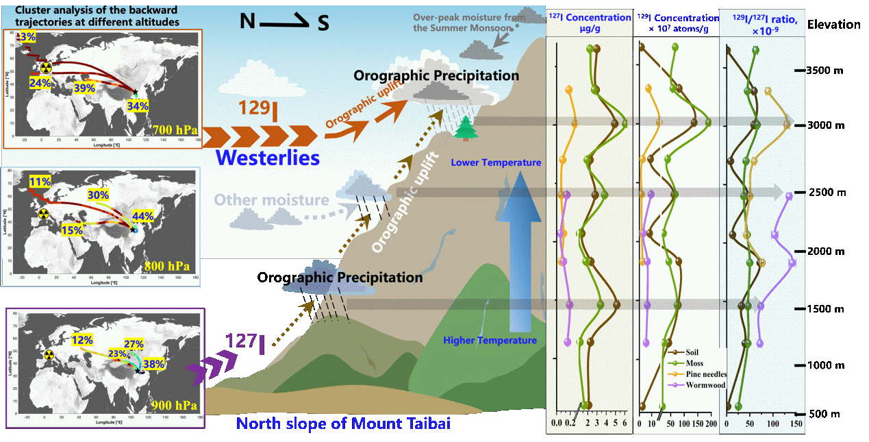 基于此,中国科学院地球环境研究所侯小琳研究员团队以秦岭太白山为研究对象,沿显著海拔梯度系统采集表层土壤、苔藓、松针及季节性植被样品,首次从多介质角度揭示了跨洲际传输气态放射性碘在高山生态系统中的沉降特征与控制机制。研究结果表明,129I与127I在不同环境介质中沿海拔呈现显著的“三峰式”分布特征(图1),其中约3000 m高程处出现最显著的富集,129I水平较低海拔区域高出一个数量级以上。结合大气后向轨迹聚类分析发现,该高值主要来源于中纬度西风带输送的跨洲际气态放射性碘,其源区与欧洲核燃料后处理设施释放的129I高度一致(图1)。进一步分析表明,高山地区独特的地形抬升效应、显著的地形降水以及有机质含量较高的土壤环境,共同促进了气态放射性碘的高效沉降与长期滞留,使山区成为跨境放射性污染物的重要“汇区”。