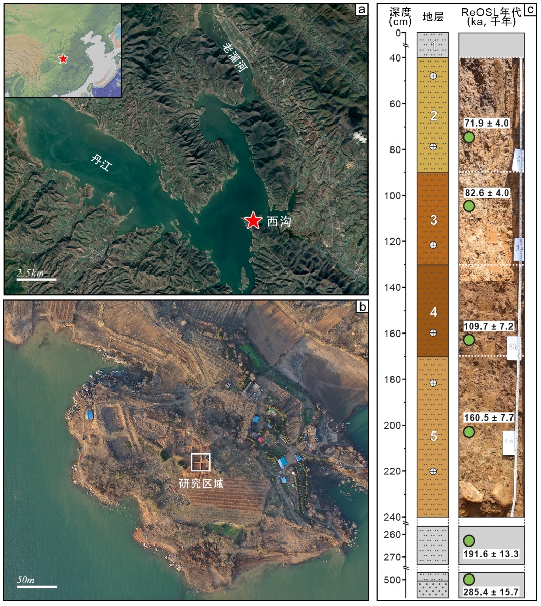 图1 西沟遗址的地理位置(a-b)与地层年代(c)