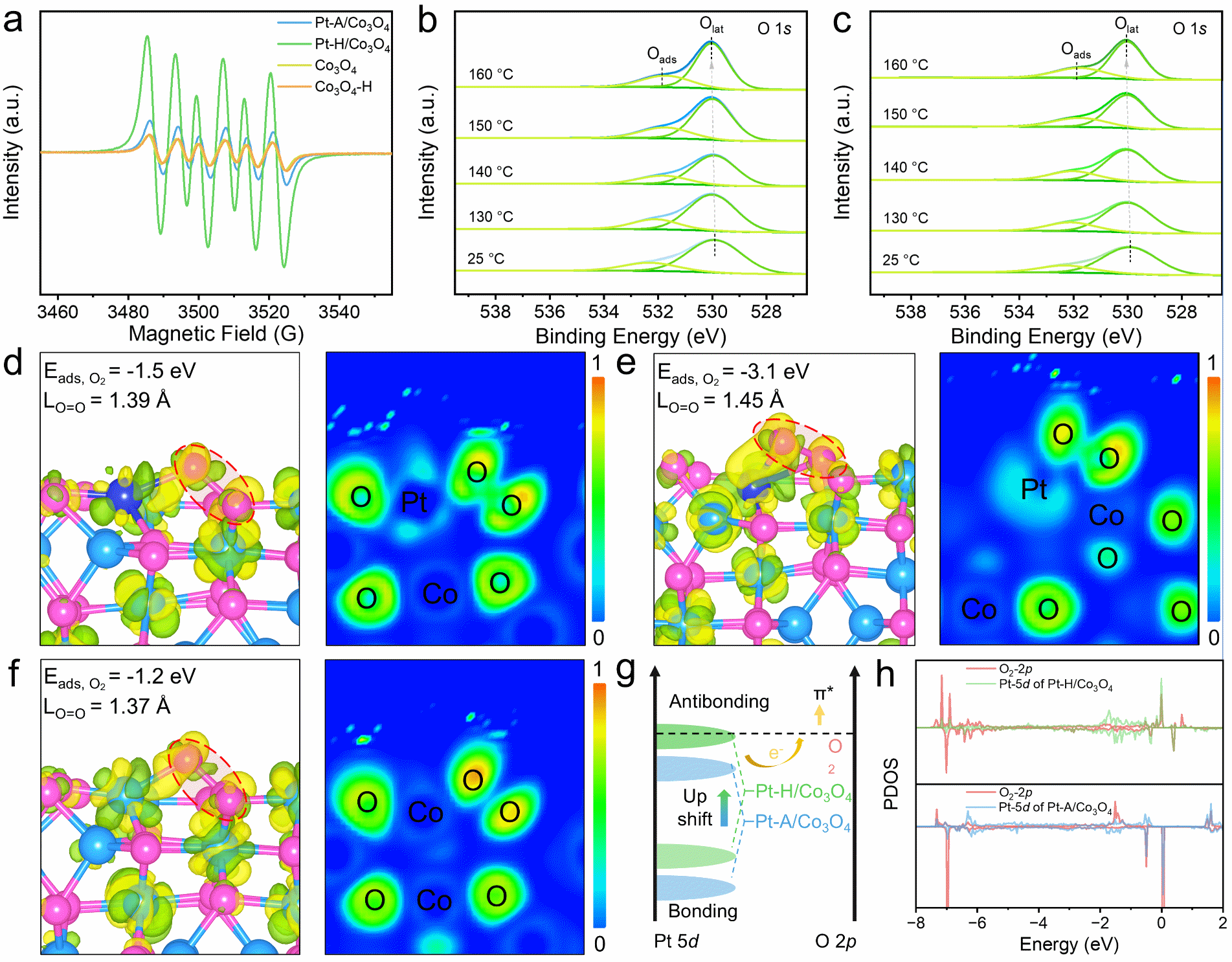 我室空气净化新技术团队(AirPNT)提出了一种构筑零价铂单原子的新路径。研究团队以富含晶格缺陷的超薄Co3O4纳米片为载体,通过低温氢气还原策略成功实现了零价铂单原子的稳定构筑。理论计算与多手段谱学表征显示,与常规的高价铂单原子相比,零价铂单原子消除了部分氧配位,形成铂与钴强相互作用的局域结构,显著优化金属与载体间电子相互作用,使铂单原子富集电子,增强了对O2的给电子能力。零价铂单原子可将O2直接活化至高活性过氧态,而高价铂单原子仅能将O2活化至活性更弱的超氧态(图1)。以甲苯这种典型VOC污染物为例,零价铂单原子在140 °C(甲苯降解率为90%对应的温度)的转化频率较高价铂单原子提升9.3倍(图2)。机理研究表明,零价铂单原子还改变了甲苯的吸附构型和反应路径,使其降解产生的中间物种更易转化,提升了催化剂稳定性(图3)。
