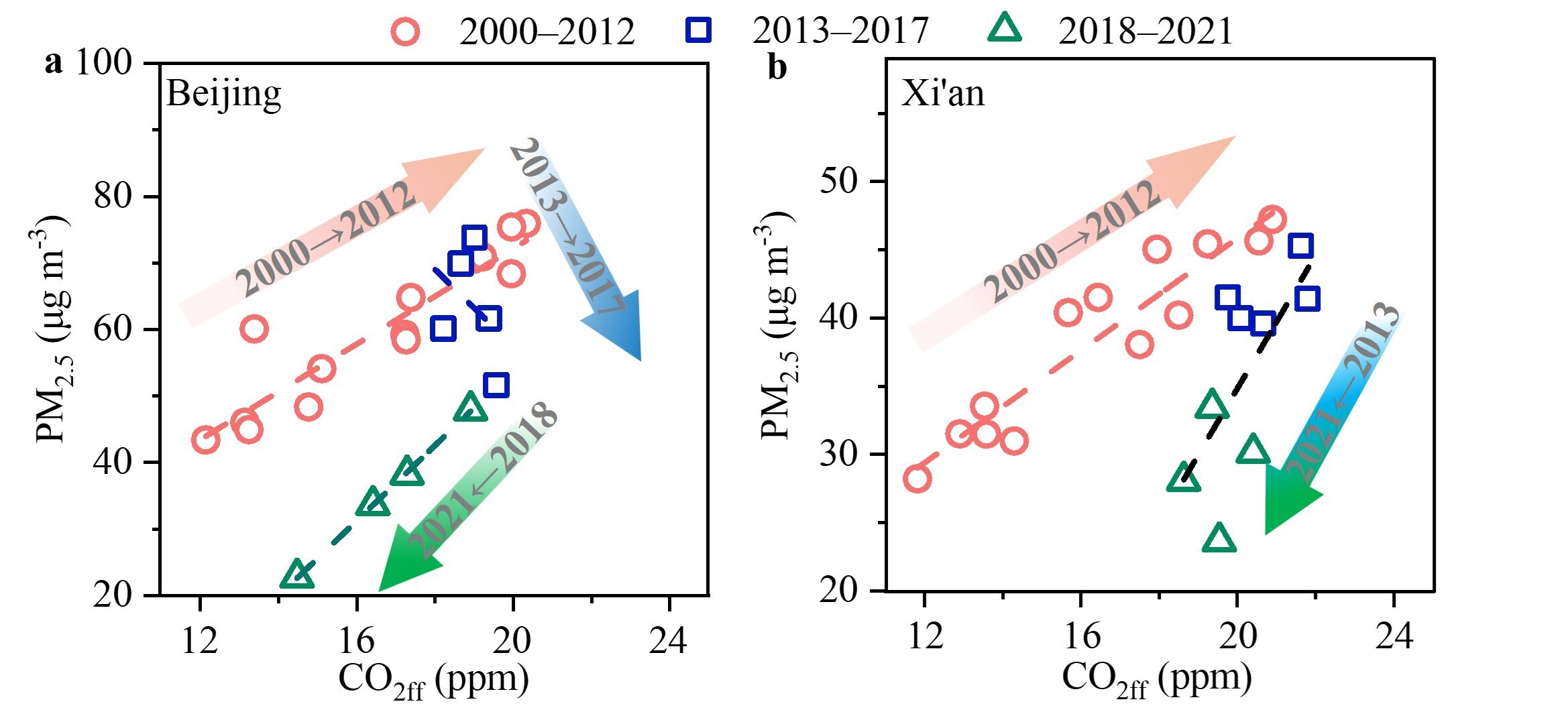 中国科学院地球环境研究所牛振川研究员及其团队通过对北京和西安树轮14C分析,重建了2000至2021年CO2ff浓度序列。结合同期的细颗粒物(PM2.5)、黑碳(BC)及一氧化碳(CO)监测数据,研究发现:在2000至2010年代初,两地CO2ff浓度与大气污染物呈同步上升趋势;自2013年系列清洁空气行动计划实施后,均出现明显下降(图1,2)。研究提出并利用PM2.5/CO2ff比值(即单位碳排放对应的污染物强度)作为衡量指标,结果显示,2013至2021年间,该强度在北京和西安分别下降了58 ± 25%和36 ± 21%(图1),反映空气污染控制效果的持续提升。进一步通过BC/CO2ff与ΔCO/CO2ff比值评估燃烧效率变化,显示两地燃烧效率在2013年后显著改善:北京两个比值分别下降54 ± 19%和44 ± 19%,西安下降幅度分别为56 ± 10%和65 ± 24%(图3,4)。这些结果有力证实,我国在空气污染治理和提升燃烧效率方面取得了实质性进展。
