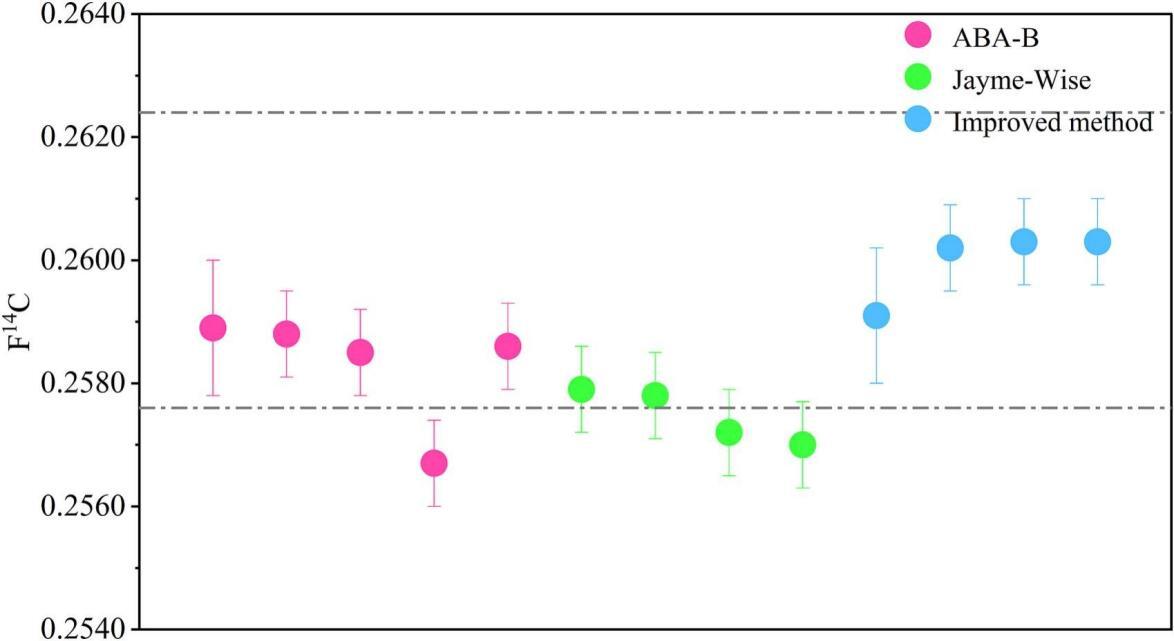 图2 第六届放射性碳测年国际比对活动的标准样品E经过不同预处理后的F14C值结果。红色、绿色和蓝色圆点分别代表经过ABA-B、Jayme-Wise和改进方法处理后的结果。误差棒代表14C测量的误差。灰色虚线代表国际共识的F14C范围(F14C=0.2600±0.0024)(Scott et al., 2017)。