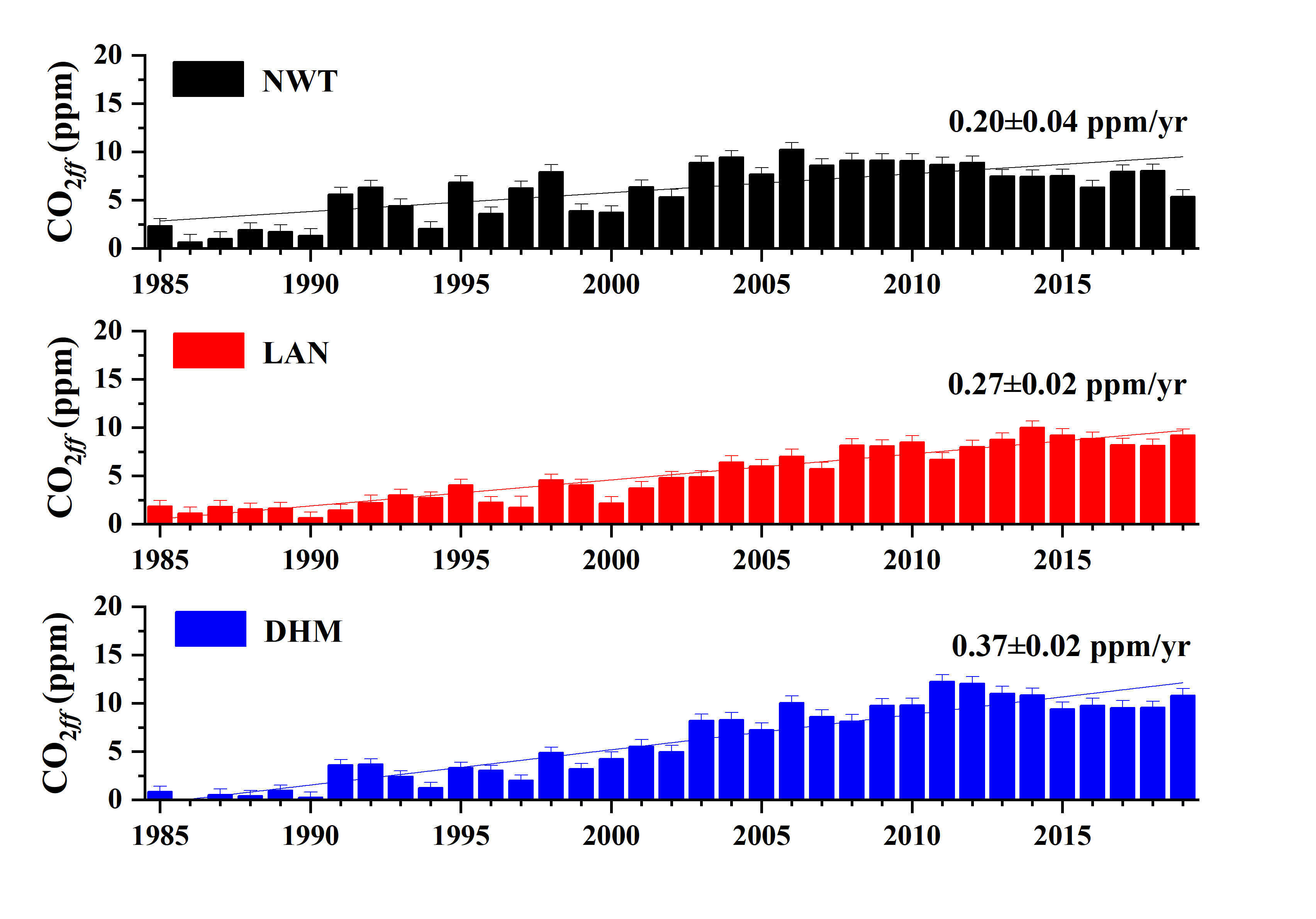 图5 1985年以来南五台、临安与鼎湖山的年度化石燃料二氧化碳(CO2ff)浓度。